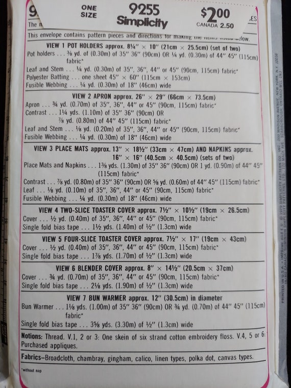 Simplicity Sewing Pattern 9255 Toaster Blender Apron Placemat Etsy